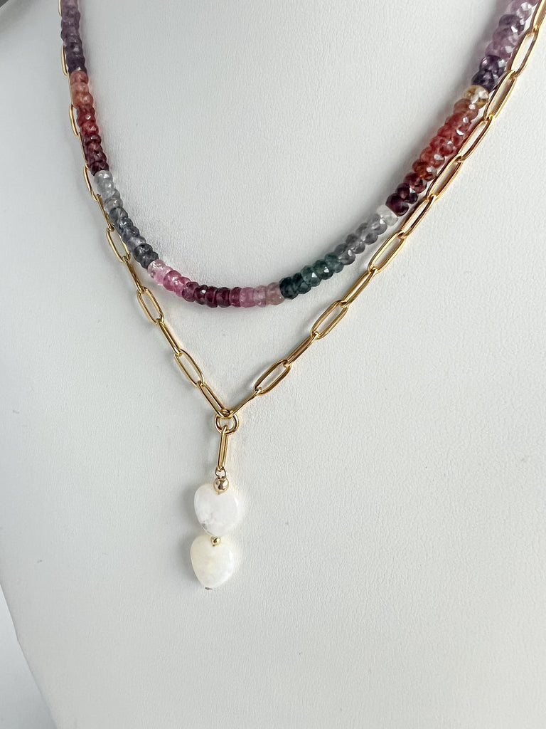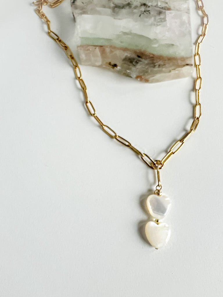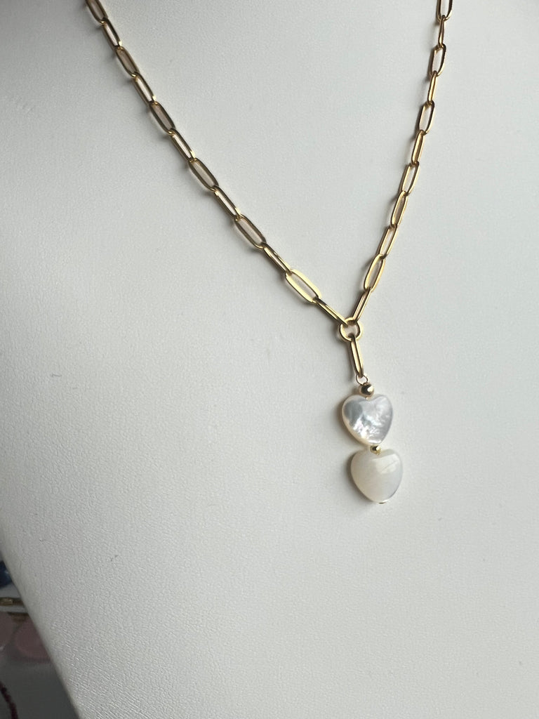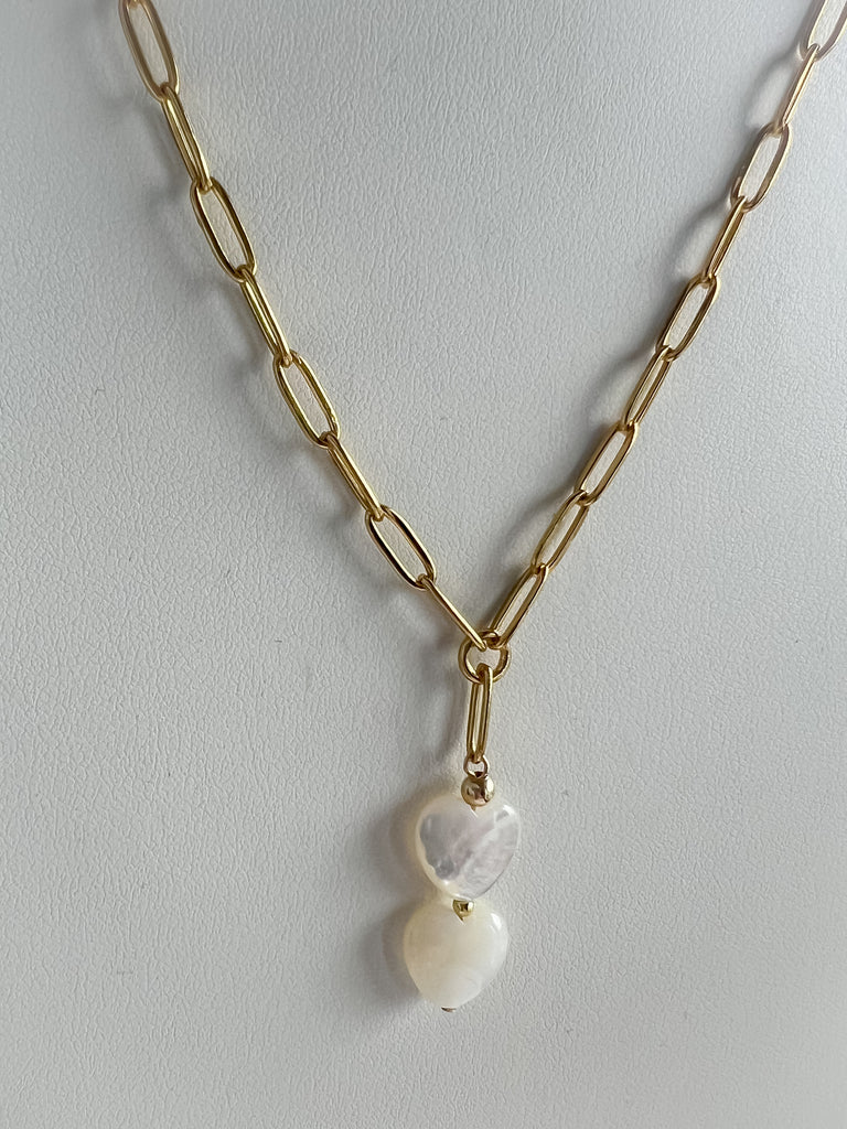 A fresh update to a BT favourite. This 18-inch chain keeps the smooth oval links and the two mother of pearl hearts you love, now made in PVD gold stainless steel. I chose this material for everyday life—it’s durable, non-tarnish, and hypoallergenic, so it holds its shine without the fuss.